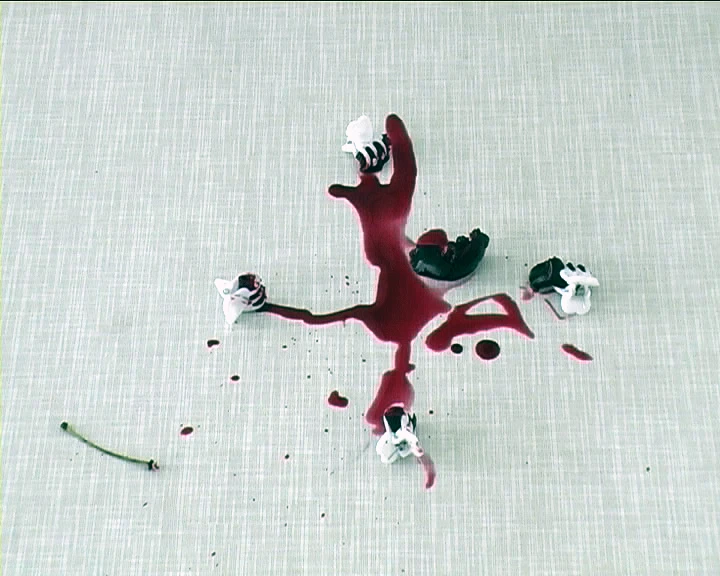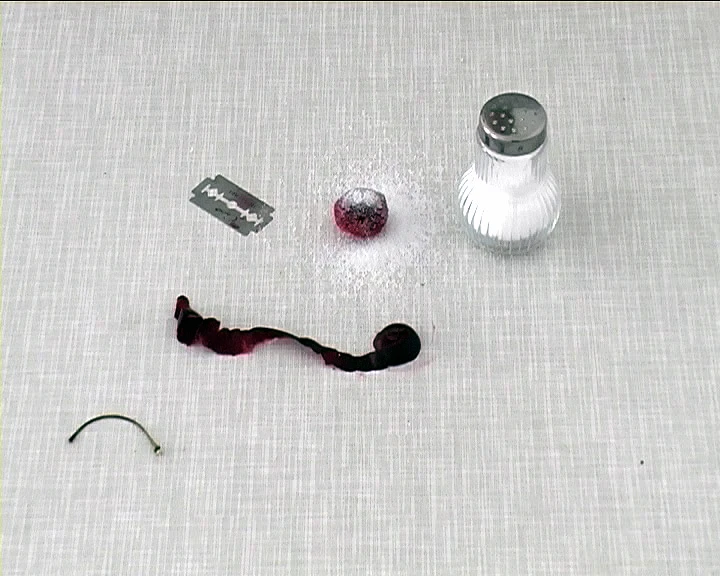 Auf einem Tisch liegen, pedantisch angeordnet, an die hundert Gegenstände aus Küche und Werkzeugkasten. Neben ihnen wurden 36 Kirschen plaziert, aufgereiht in einer exakten Formation. Die in Schwarz gekleidete Performerin bindet sich mit ruhigen Bewegungen eine weiße Schürze um, nimmt eine Kirsche und befreit sie von ihrem Stiel. Sie wählt eine Packung Zahnseide sowie eine Rolle Klebeband aus. Beides legt sie auf einem zweiten Tisch ab, dann reißt sie ein längeres Stück Zahnseide ab, bindet den Faden um die Kirsche, und klebt das andere Ende des Fadens an der Tischkante fest. Nur einen kurzen Moment wird die Kirsche an der Kante abgelegt - dann stößt die Performerin sie sanft in die Tiefe: Die Kirsche fällt abrupt und baumelt in der Luft am zahnseidenen Faden. Schon ist die nächste Kirsche an der Reihe: Sie wird mit Klebeband an einem Stein befestigt, um in einem mit Wasser gefüllten Plastikbecher zu ertrinken. Die Dritte ereilt die Vierteilung durch weiße Plastikhaarklammern; zurück bleibt ein Blutbad auf der Tischdecke. Nummer Vier wird gehäutet, doch nicht genug: Auf das rohe Fleisch kommt noch eine Prise Salz ...