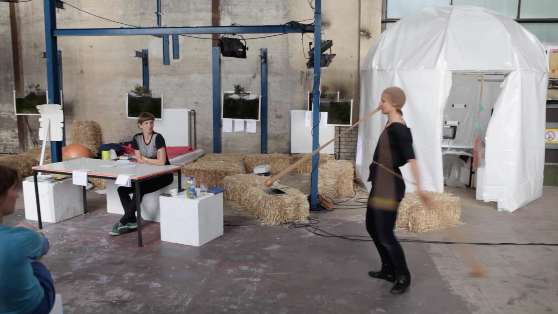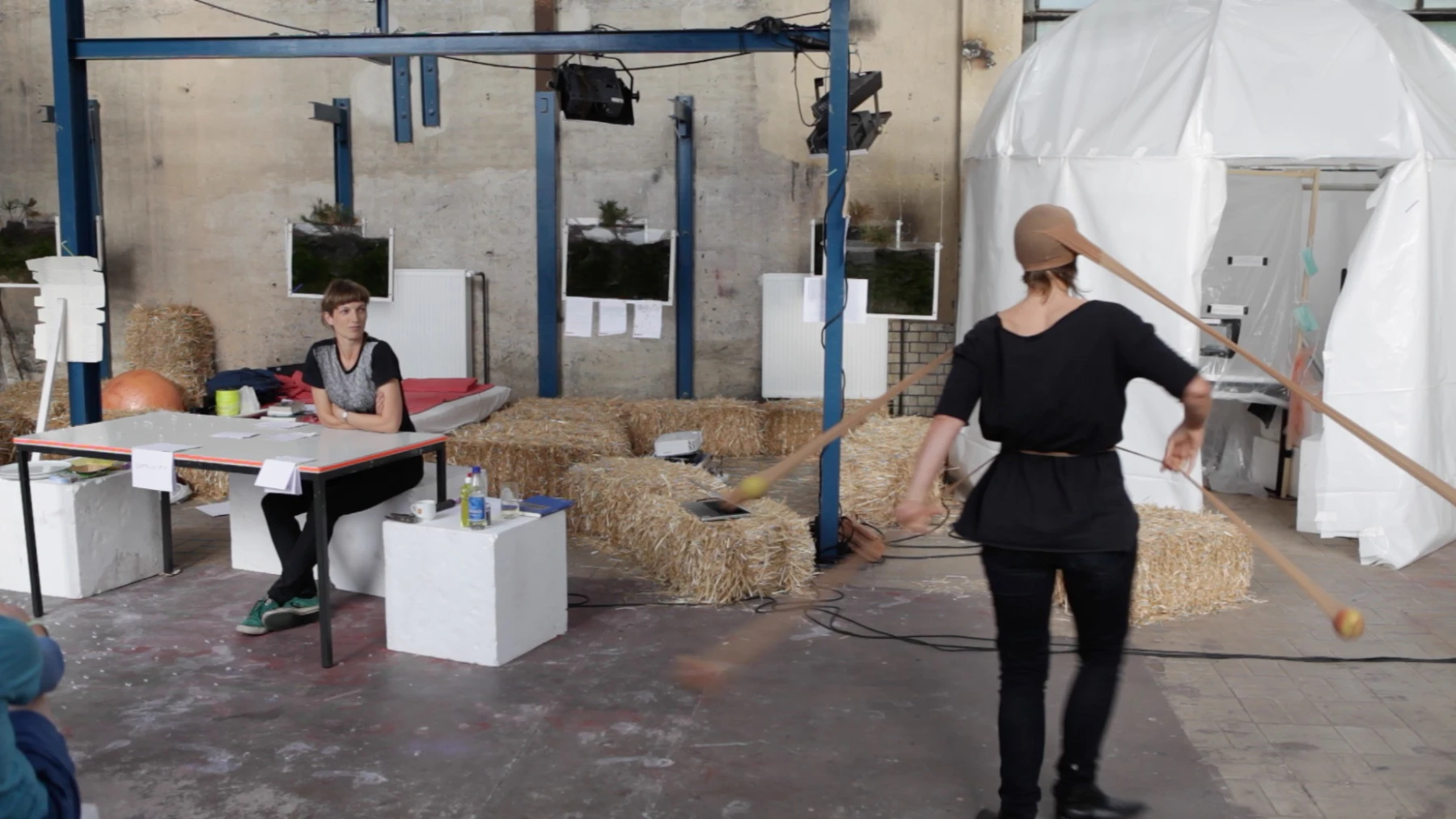 Kate McIntosh und Eva Meyer-Keller belebten damit eine Konversationspraxis wieder, die sie erstmals 2008 mit de-place begonnen haben. Sie entwickelt sich vom Reden zum Handeln, vom Gedanken zum Spiel und stösst ein Pingpong aus Inspirationen und Kuriositäten, Provokationen und Zweifeln, Politik und Witz an - bis sich aus diesem Myzel der Drehungen, Wendungen und intuitiven Gedankensprünge ein zwielichtiges geteiltes Wissen herausschält und wie eine eigenständige Kreatur seinen Kopf erhebt ...