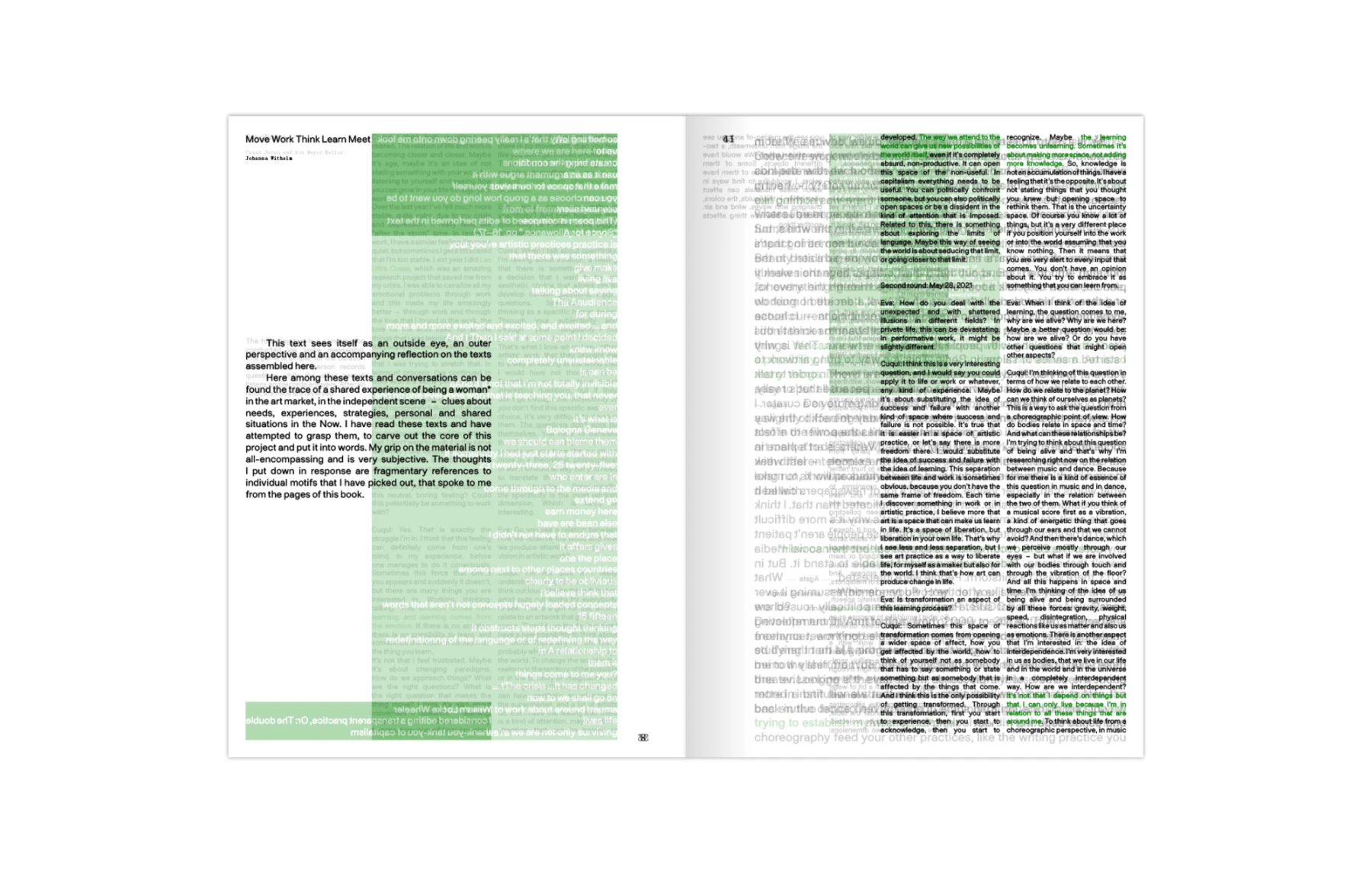 Johanna Withelm … The conversations collected in this reader bear witness to explorations of personal spaces, of collective art creation, of one’s own position, of needs and of access to the things one does. Opening oneself up to different perspectives and seeing the complexity of life – the whole shebang – and how everything is intertwined with everything. And taking on the big questions – how can this complexity be successfully unfurled in one’s work? How can these moments be interwoven with one another – the good ones and the uncomfortable ones – and how can we manage not to exclude these uncomfortable feelings but rather incorporate them into artmaking? How can we learn a caring and supportive way of encountering artmaking?