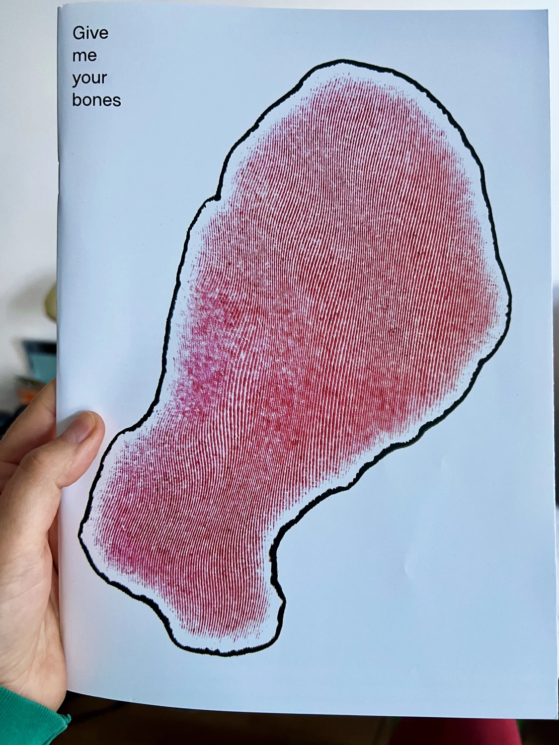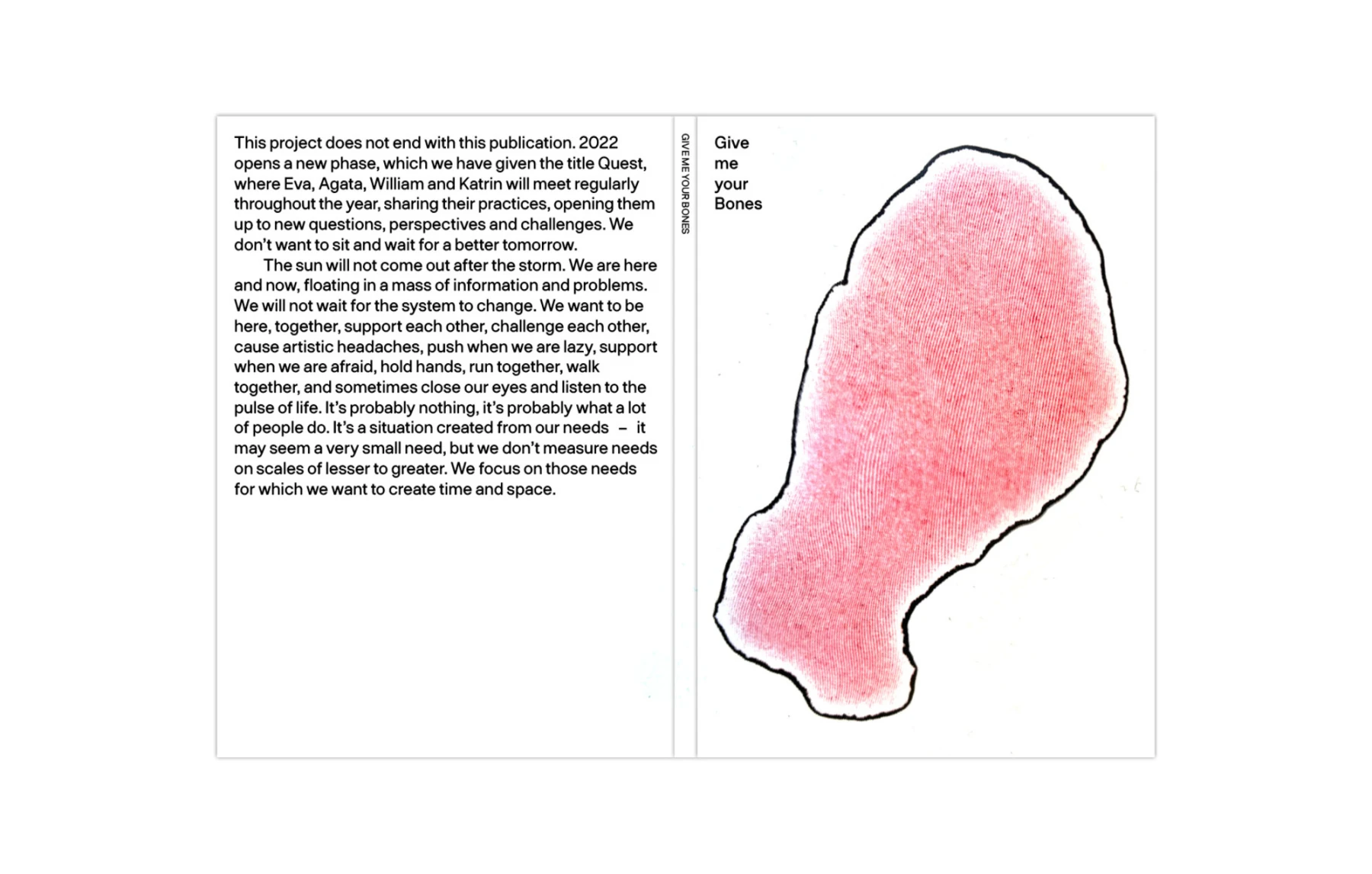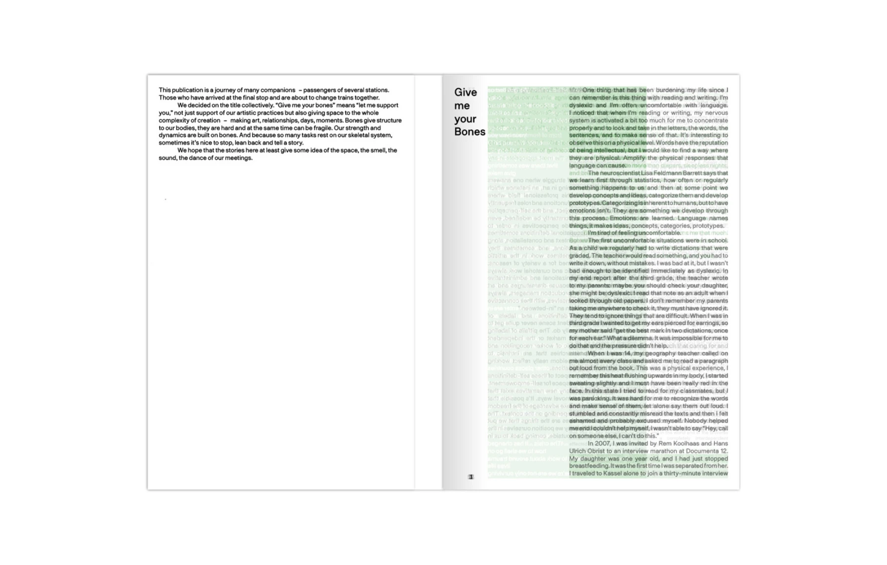 Diese Publikation ist eine Reise mit vielen Begleiter*innen - Fahrgästen mehrerer Bahnhöfe. Diejenigen, die an der Endhaltestelle angekommen sind und nun gemeinsam umsteigen werden. Wir haben uns gemeinsam für den Titel entschieden. "Give me your bones" bedeutet "lass mich dich unterstützen", nicht nur im Sinne einer gegenseitigen Unterstützung unserer künstlerischen Praktiken, sondern auch im Sinne davon, der ganzen Komplexität des Schaffens Raum zu geben - dem Kunst machen, den Beziehungen, den Tagen, den Momenten. Knochen geben unserem Körper Struktur, sie sind hart und können gleichzeitig zerbrechlich sein. Unsere Stärke und Dynamik sind auf Knochen aufgebaut. Und weil so viele Aufgaben auf unserem Skelettsystem ruhen, ist es manchmal schön, innezuhalten, sich zurückzulehnen und eine Geschichte zu erzählen. Wir hoffen, dass die Geschichten hier zumindest eine Vorstellung von dem Raum, dem Geruch, dem Klang und dem Tanz unserer Treffen vermitteln.