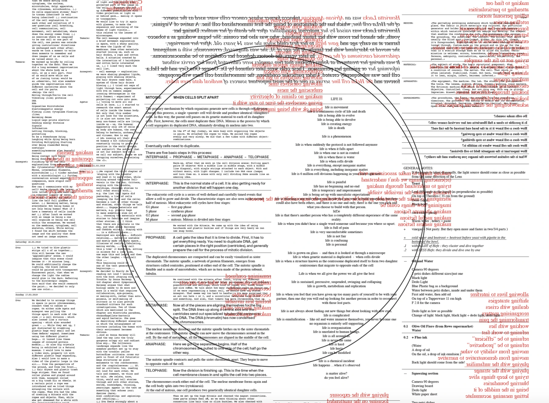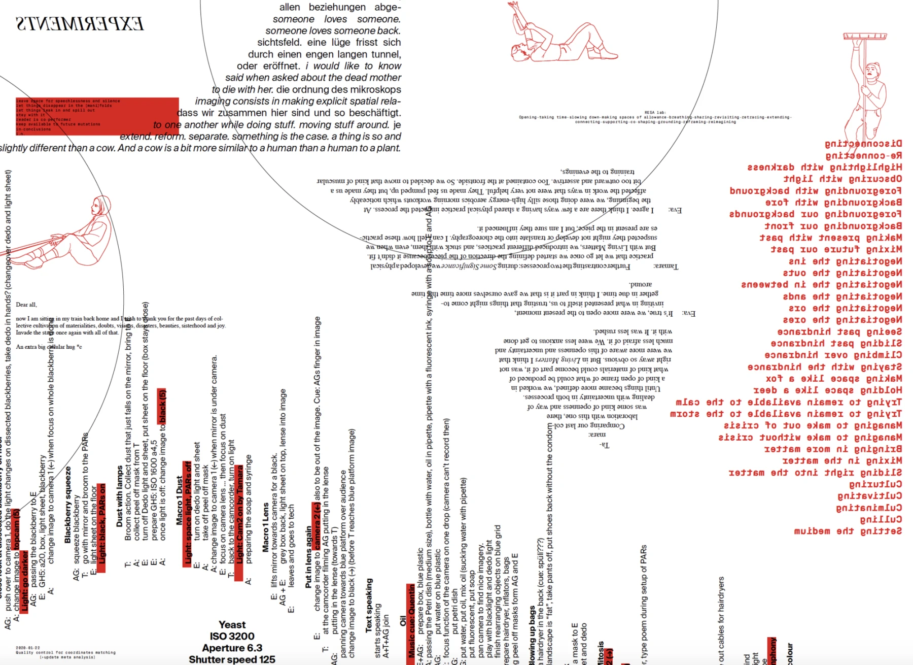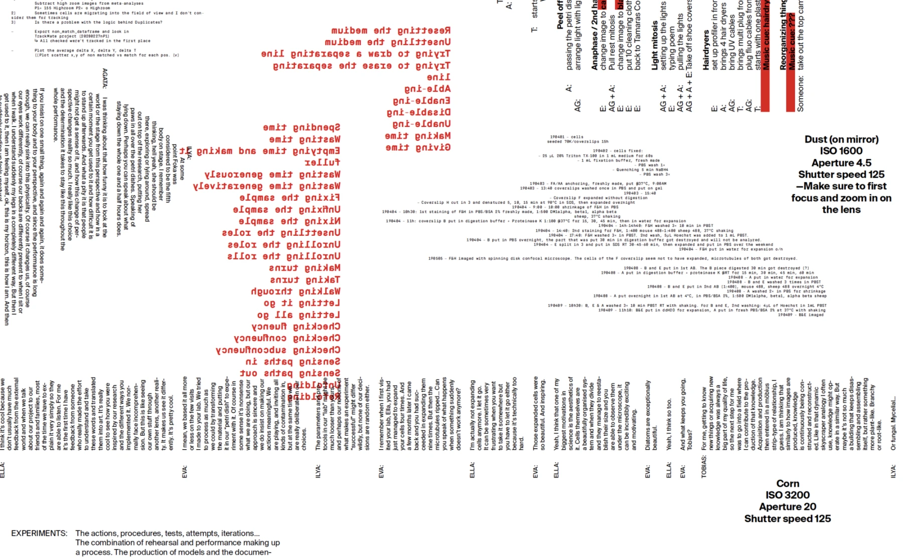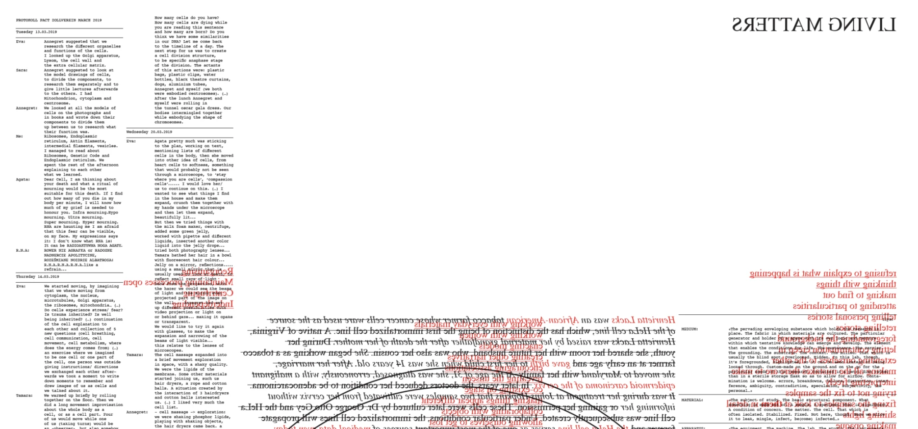 Ein sich entfaltendes Künstlerinnenbuch in 3 Bänden und 7 Teilen (im Wachstum begriffen) LM: M-M-A-E ist eine papierne Petrischale, in der Eva Meyer-Keller und ihre Recherchepartnerin Ilya Noé eine Kultur von Materialien angelegt haben: entstanden aus, mit, um und neben 'Living Matters'. Enthalten: Arbeitsnotizen, Studio/Laborprotokolle, Ausschnitte aus Gesprächen, Tagebucheinträge und eine Mannigfaltigkeit anderer Materi(ali)en und Verschmutzungen, (neu)vermischt und eingebunden in einen langsamen Prozess der Reproduktion und Transformation. Lose geordnet nach vier Recherchebereichen (Medium, Material, Apparat und Experimente) sind sie weder eine umfassende noch eindeutige Sammlung von Dingen, sondern eher Stichproben eines fortlaufenden, mitotischen Prozesses. Dieses 'lebendige' Dokument bleibt verfüg- und veränderbar für kommende Wiederholungen und Mutationen.