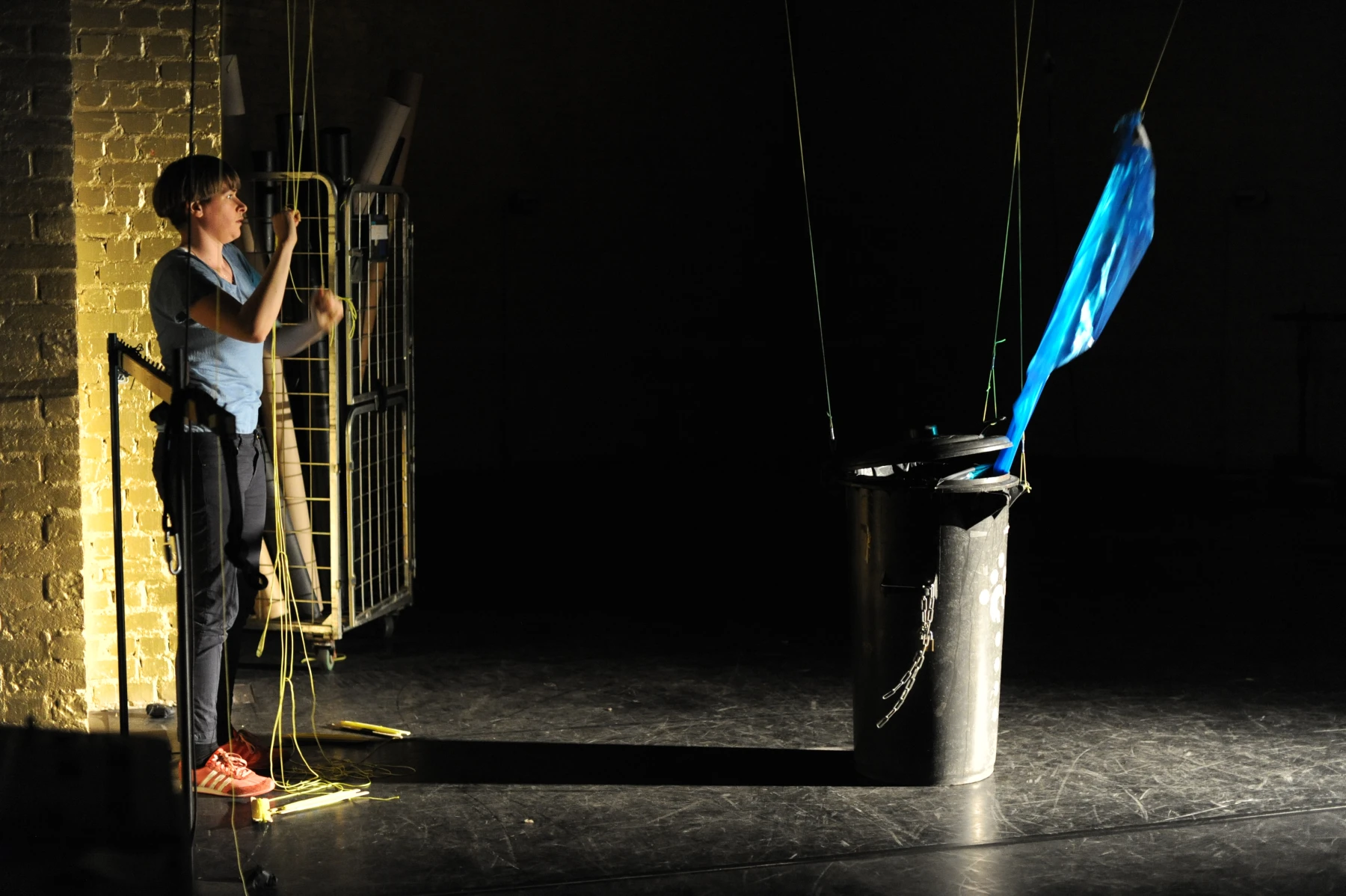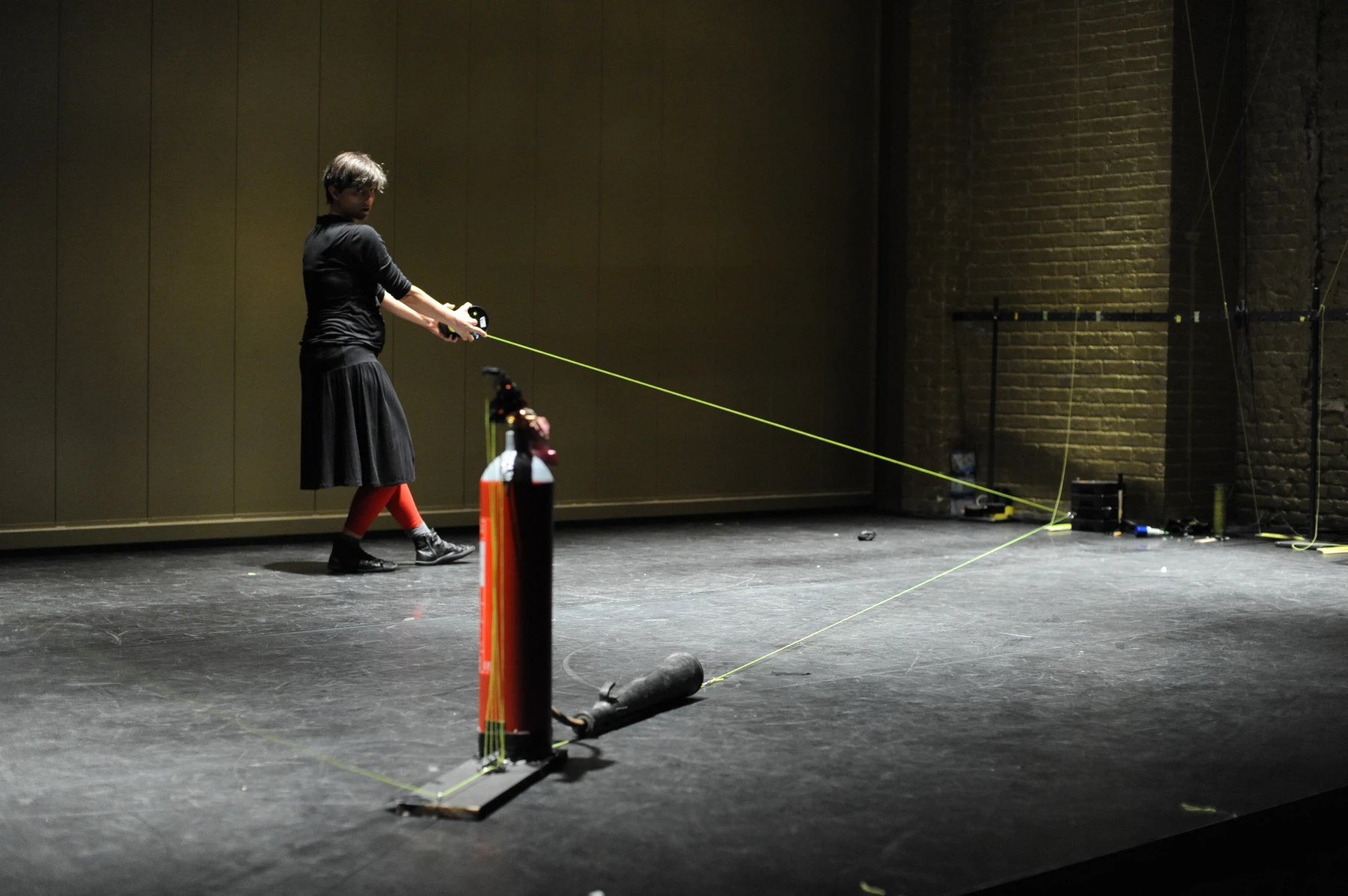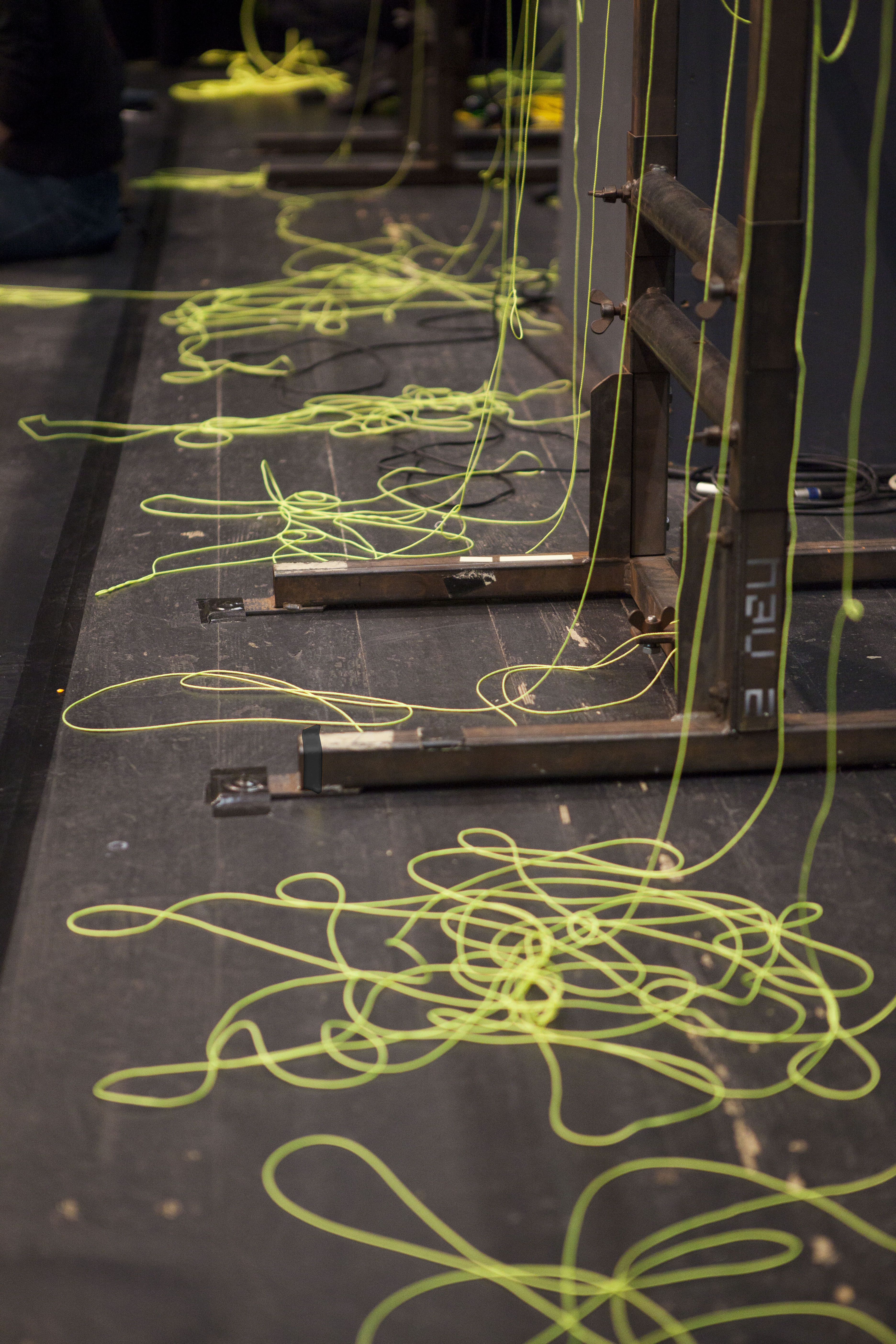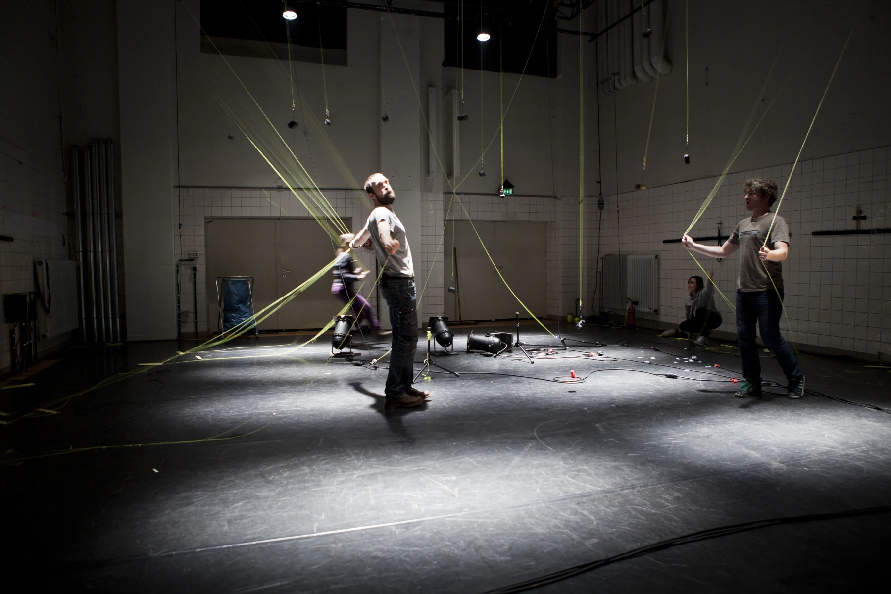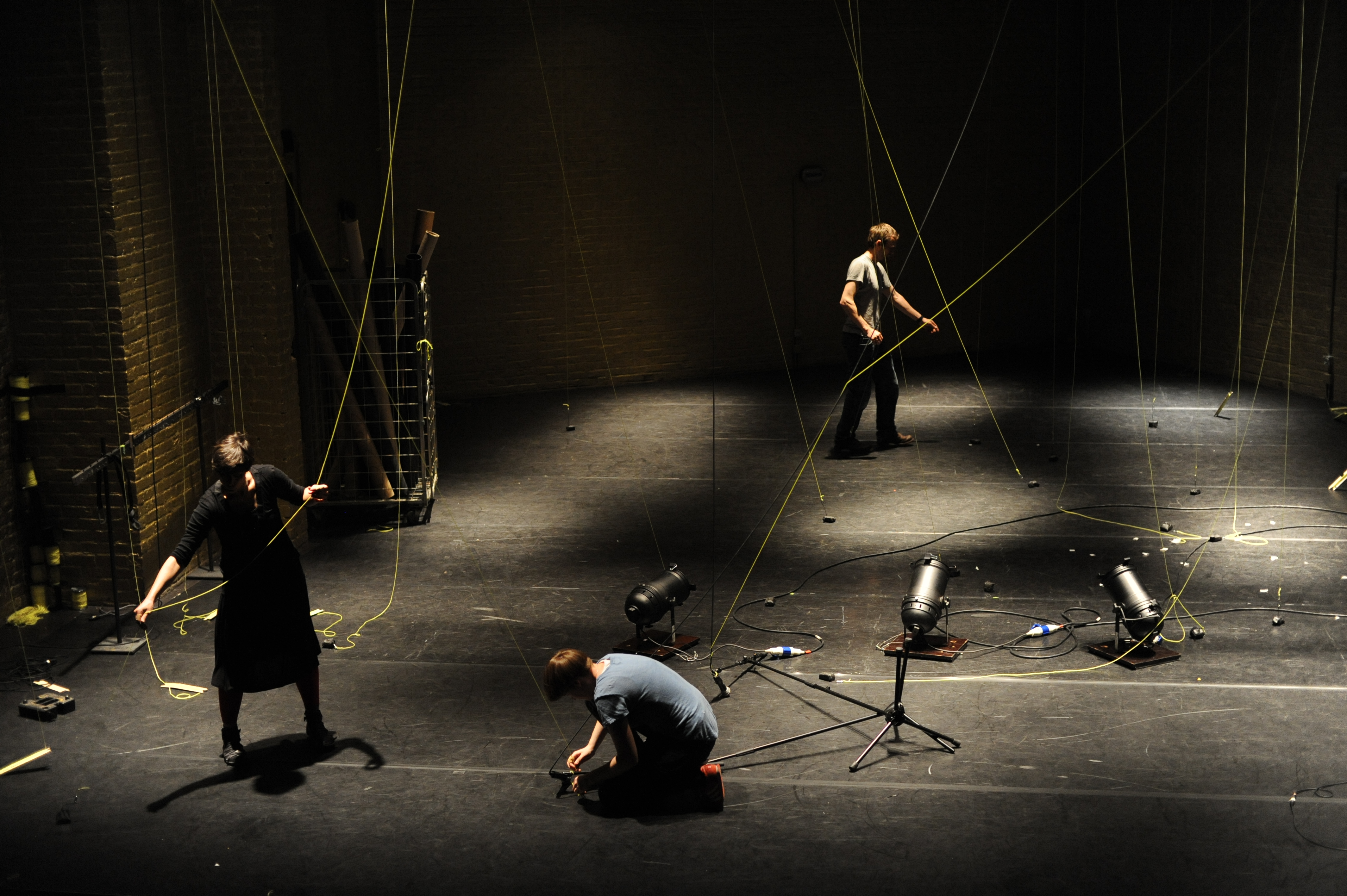 Leuchtend gelbe Fäden sind auf voller Länge durch den ganzen Raum gespannt. An dem einen ihrer Enden sind die Einrichtungsgegenstände des Theaterbetriebs befestigt: Scheinwerfer, Lautsprecher, Verlängerungskabel, Vorhänge oder Reinigungsutensilien. Am anderen Ende agieren die PerformerInnen und TechnikerInnen. Sie ziehen hier die Fäden ziehen, spannen sie weiter und bringen so das Inventar in Bewegung: Langsam und kontinuierlich, von einem schabenden Geräusch begleitet, kriecht ein Feuerlöscher über den Boden, einmal quer über die Bühne. Auf der Hälfte der Diagonale hält er inne - oder vielmehr die PerformerIn, die bisher an seinem Faden zog. Eine zweite Schnur sorgt dafür, dass der Feuerlöscher losgeht: Das Löschmittel stiebt in einer großen Wolke in die Luft. Als die rote Gestalt mechanisch ihren Weg fortsetzt, bleibt in der Bühnenmitte ein weißer Fleck zurück.