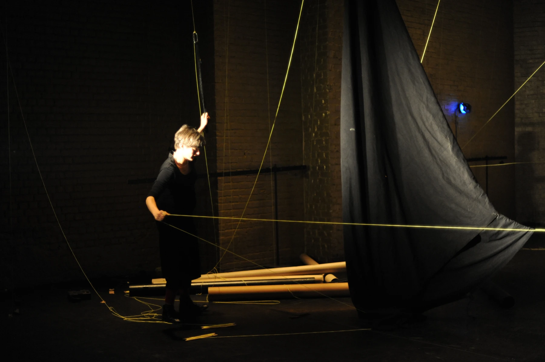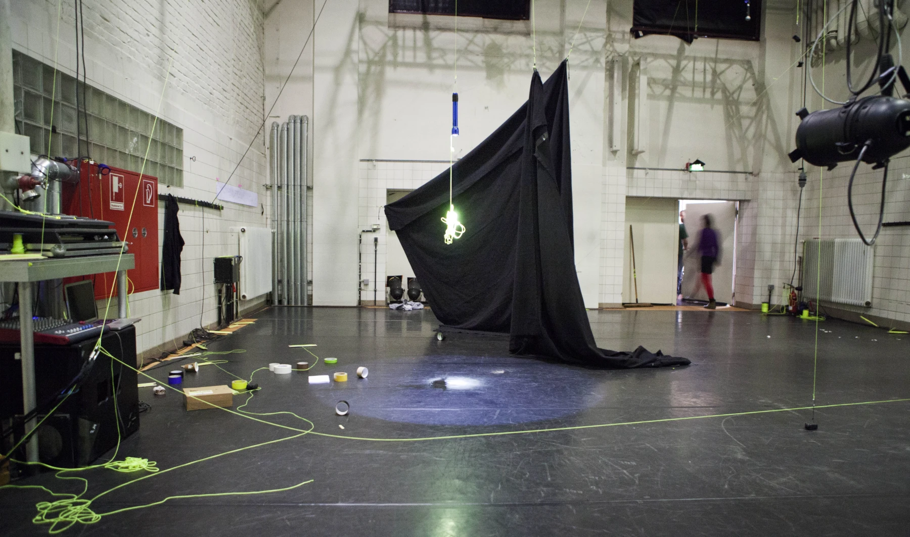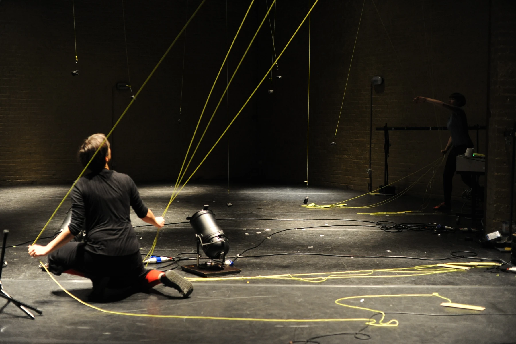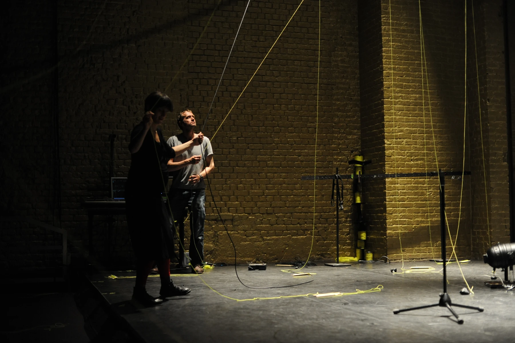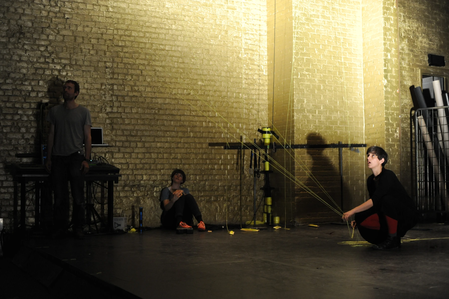 Leuchtend gelbe Fäden sind auf voller Länge durch den ganzen Raum gespannt. An dem einen ihrer Enden sind die Einrichtungsgegenstände des Theaterbetriebs befestigt: Scheinwerfer, Lautsprecher, Verlängerungskabel, Vorhänge oder Reinigungsutensilien. Am anderen Ende agieren die PerformerInnen und TechnikerInnen. Sie ziehen hier die Fäden ziehen, spannen sie weiter und bringen so das Inventar in Bewegung: Langsam und kontinuierlich, von einem schabenden Geräusch begleitet, kriecht ein Feuerlöscher über den Boden, einmal quer über die Bühne. Auf der Hälfte der Diagonale hält er inne - oder vielmehr die PerformerIn, die bisher an seinem Faden zog. Eine zweite Schnur sorgt dafür, dass der Feuerlöscher losgeht: Das Löschmittel stiebt in einer großen Wolke in die Luft. Als die rote Gestalt mechanisch ihren Weg fortsetzt, bleibt in der Bühnenmitte ein weißer Fleck zurück.