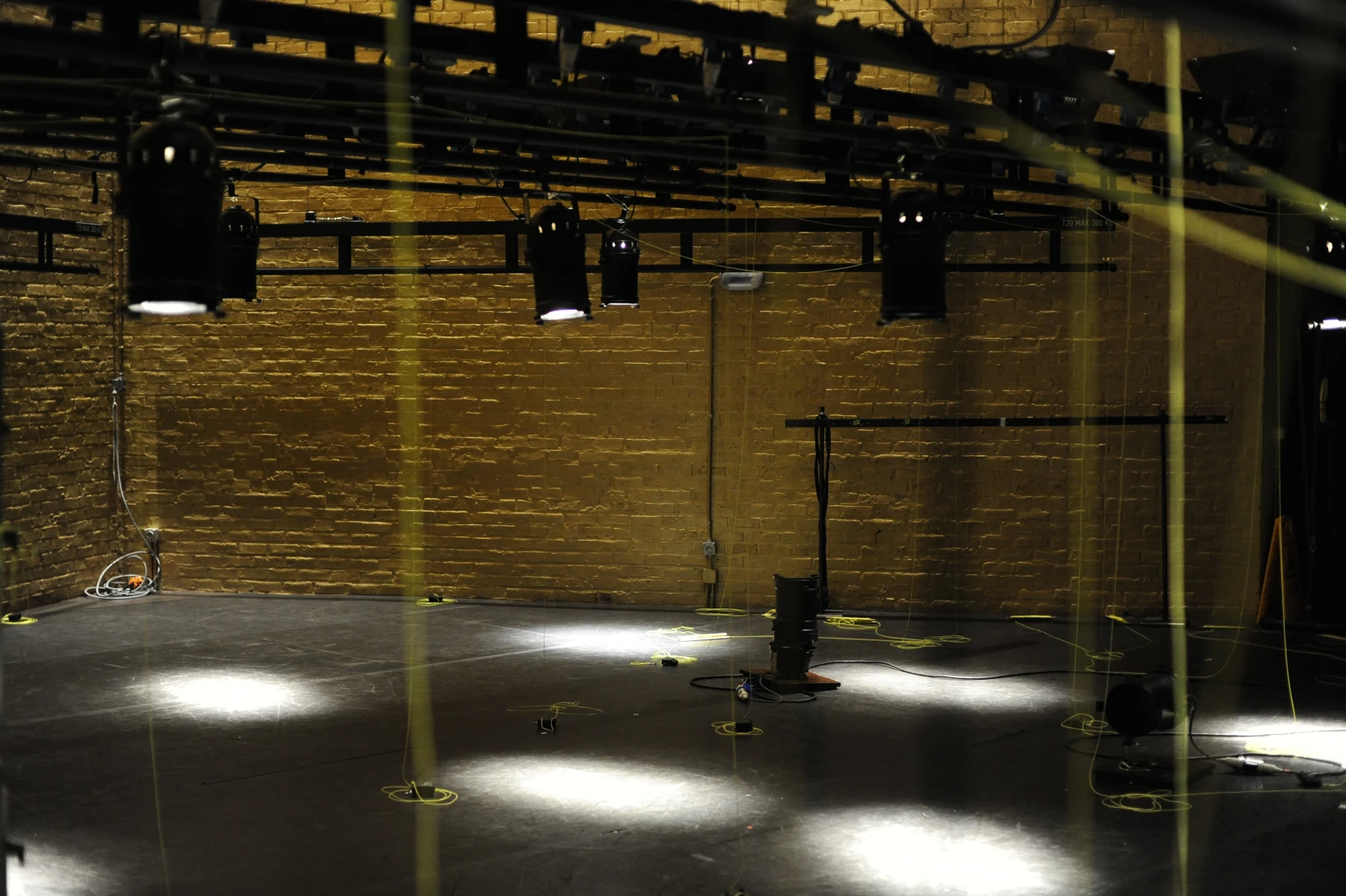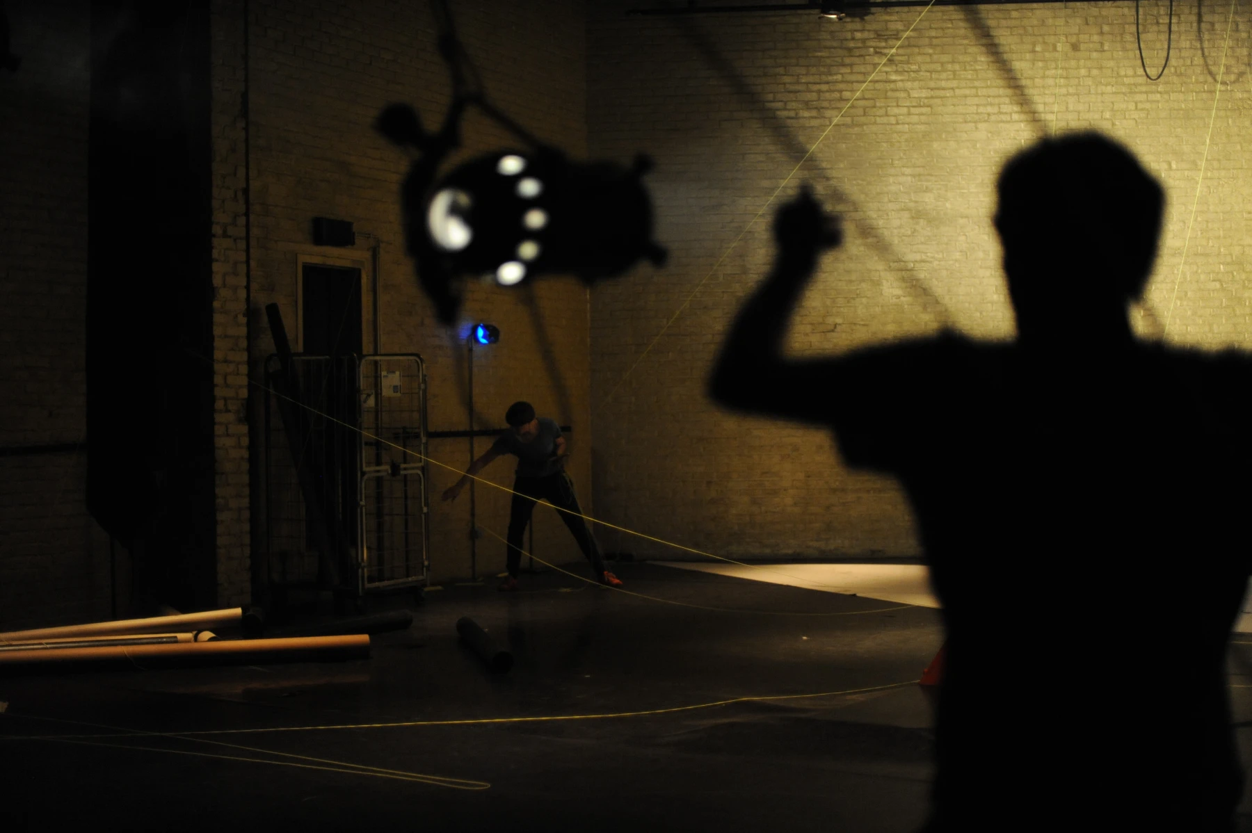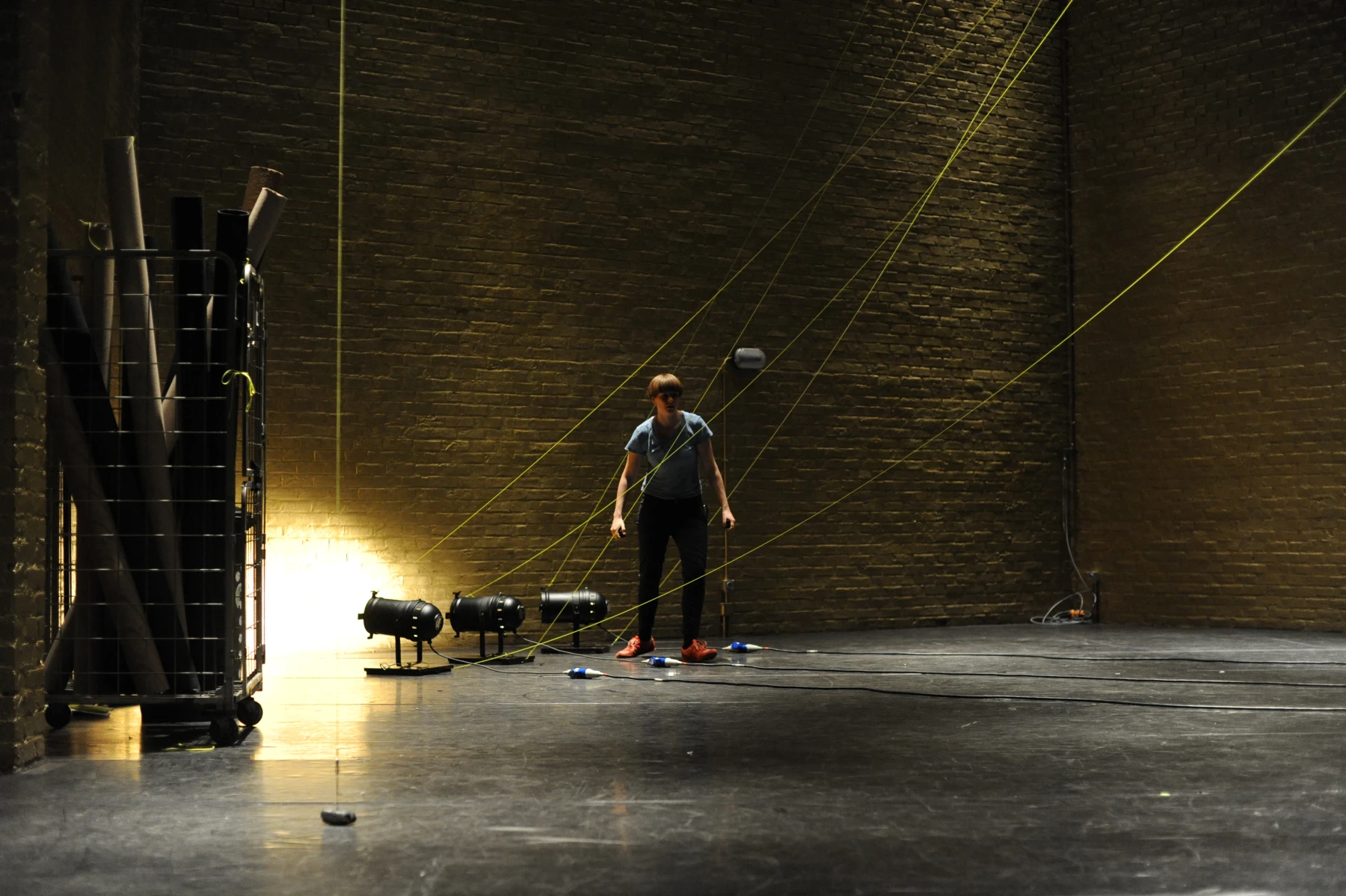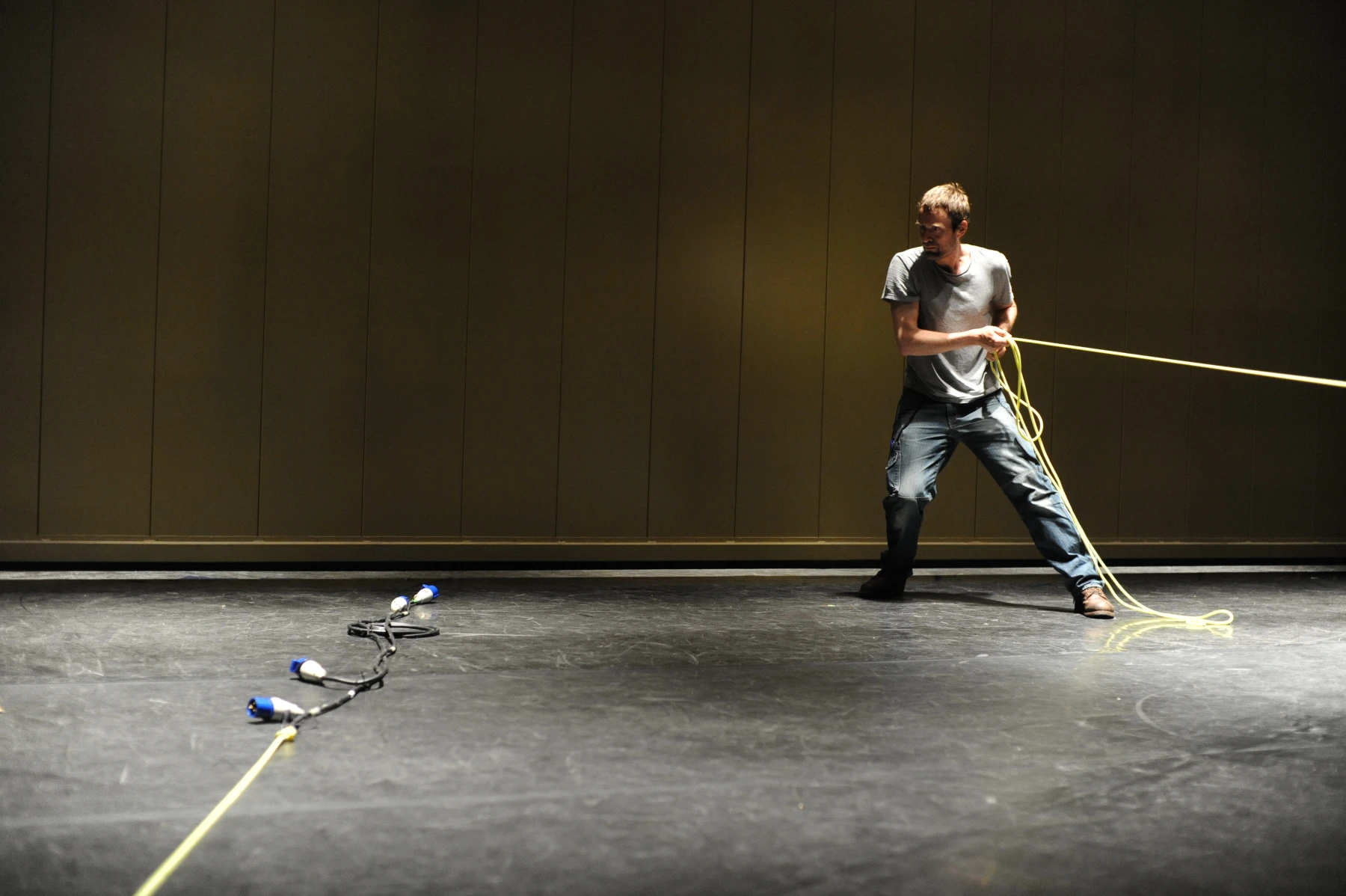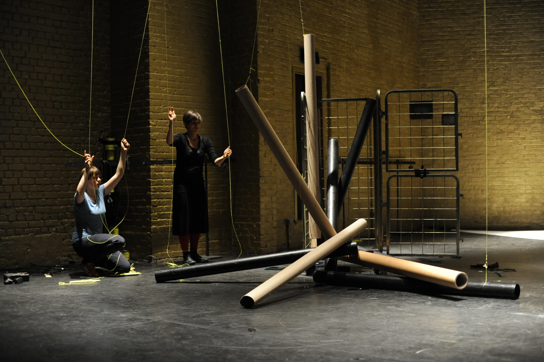 Leuchtend gelbe Fäden sind auf voller Länge durch den ganzen Raum gespannt. An dem einen ihrer Enden sind die Einrichtungsgegenstände des Theaterbetriebs befestigt: Scheinwerfer, Lautsprecher, Verlängerungskabel, Vorhänge oder Reinigungsutensilien. Am anderen Ende agieren die PerformerInnen und TechnikerInnen. Sie ziehen hier die Fäden ziehen, spannen sie weiter und bringen so das Inventar in Bewegung: Langsam und kontinuierlich, von einem schabenden Geräusch begleitet, kriecht ein Feuerlöscher über den Boden, einmal quer über die Bühne. Auf der Hälfte der Diagonale hält er inne - oder vielmehr die PerformerIn, die bisher an seinem Faden zog. Eine zweite Schnur sorgt dafür, dass der Feuerlöscher losgeht: Das Löschmittel stiebt in einer großen Wolke in die Luft. Als die rote Gestalt mechanisch ihren Weg fortsetzt, bleibt in der Bühnenmitte ein weißer Fleck zurück.