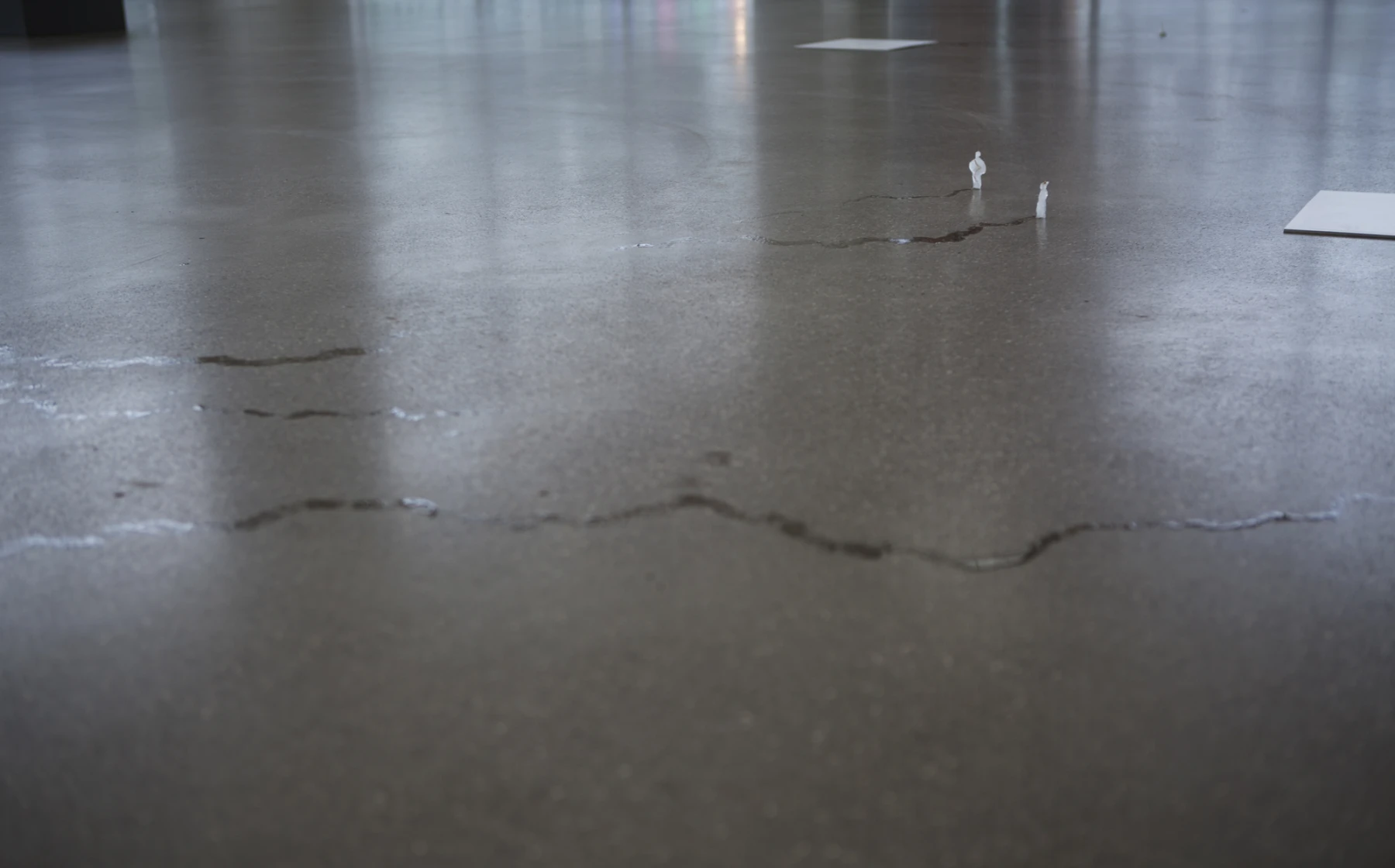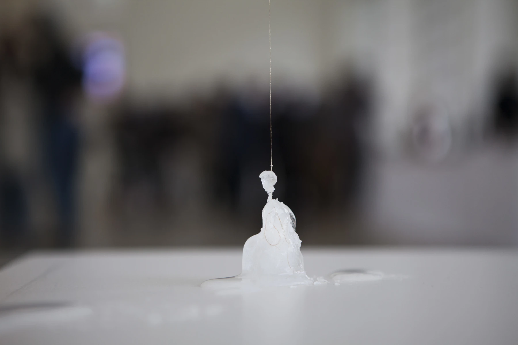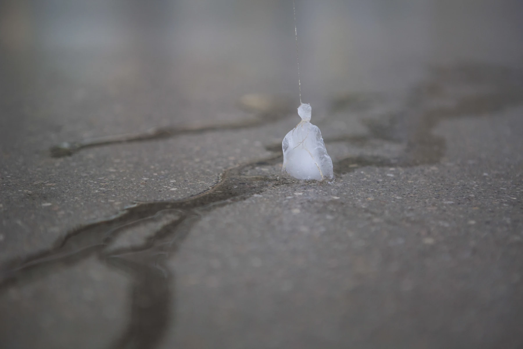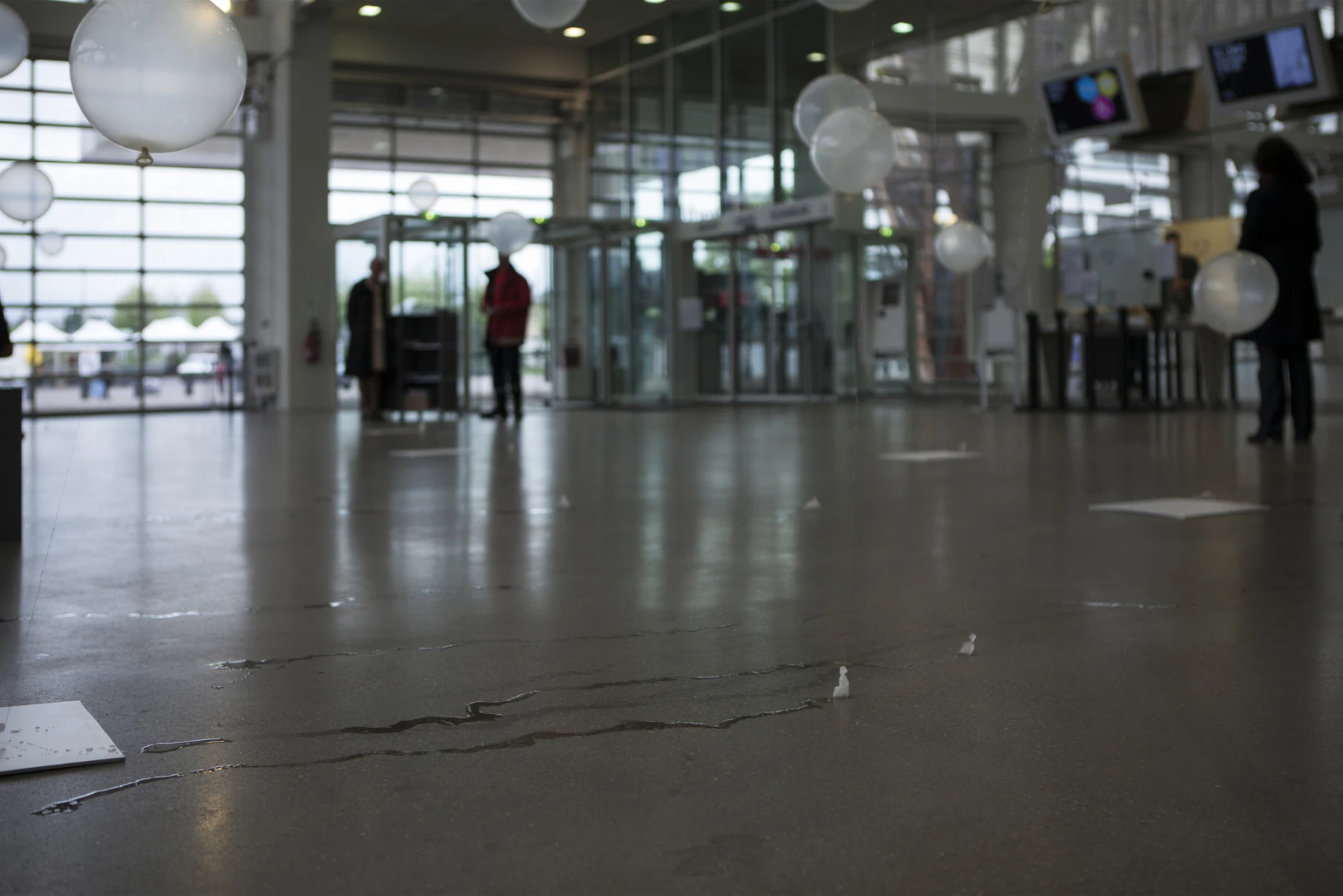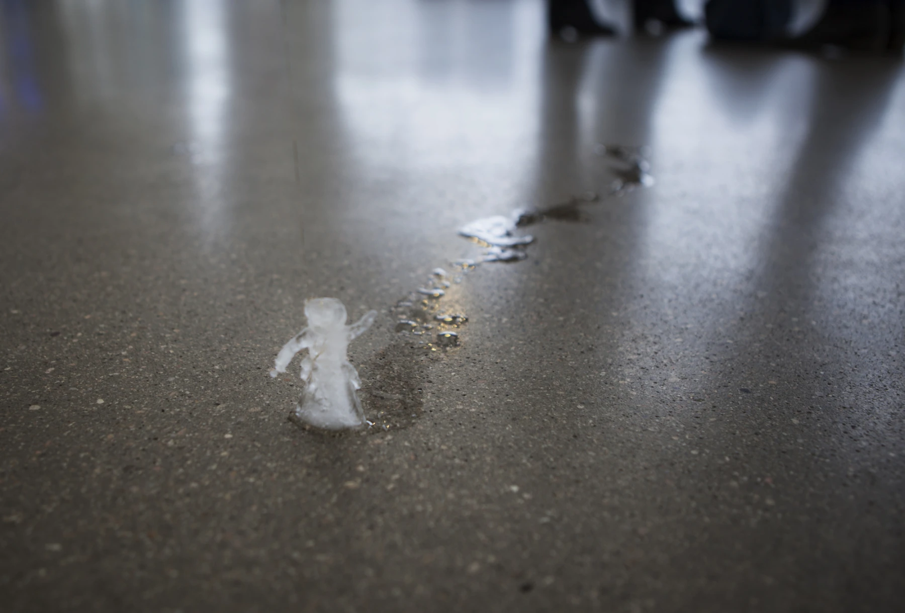 Mit Helium gefüllte Luftballons schweben verteilt im Raum. Von kleinen Figuren, die mit einer Schnur an ihnen befestigt sind, werden sie zunächst am Boden gehalten. Es sind aus Eis nachmodellierte Spielzeug-Figuren aus der ehemaligen DDR: kleine NVA-Soldaten, Cowboys und Indianer. Je mehr sie zu schmelzen beginnen und ihre Wasserspuren auf dem Boden hinterlassen, umso mehr verlieren sie auch an Gewicht, bis die Ballons nach und nach in die Höhe steigen.